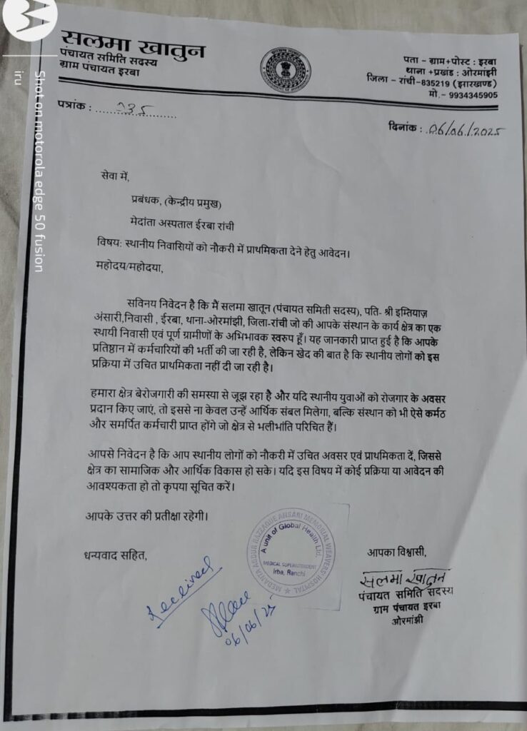 Ranchi: Salma Khatoon, a member of the Panchayat Committee from the Irba region in Ranchi district, has submitted a formal letter to Medanta Hospital, Irba, urging that unemployed local youth be given priority in the hospital’s ongoing recruitment process. The letter was handed over to the hospital administration by her son, Tariq Ohdar.